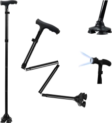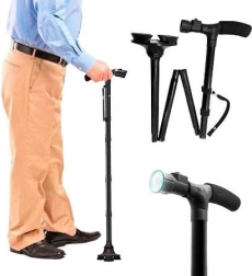 Składana laska z lampką LED to idealne rozwiązanie dla osób z problemami ruchowymi. Wykonana z wysokiej jakości i trwałych materiałów, cechuje się niską wagą, co gwarantuje maksymalny komfort i łatwość obsługi. Laska sama utrzymuje się w pozycji pionowej dzięki 4-punktowemu podparciu i obrotowemu przegubowi o 360°.