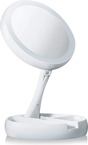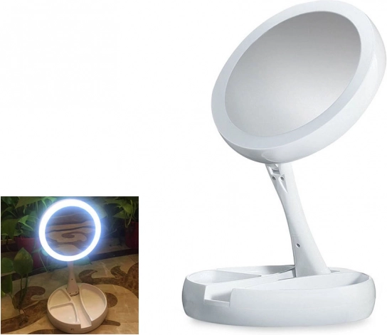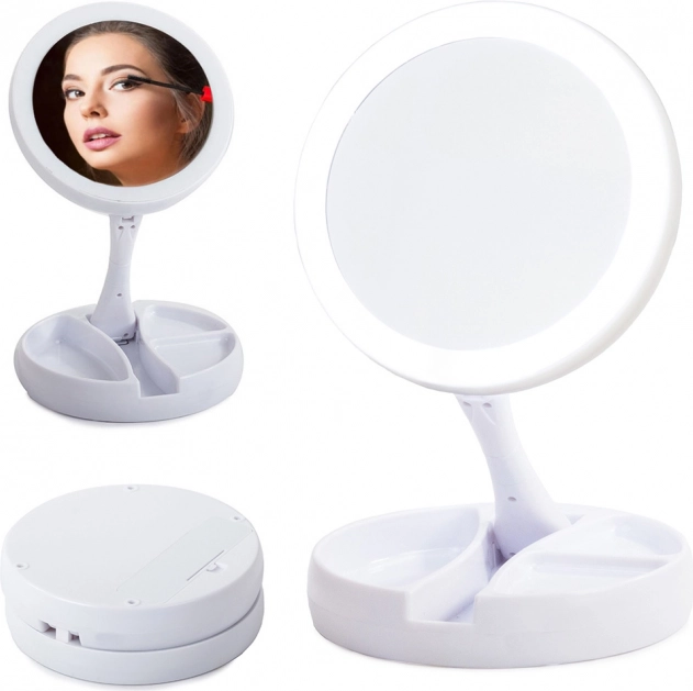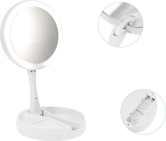 Stabilna podstawa z przegródkami na drobiazgi pozwala mieć pod ręką pędzle, pęsetę czy pomadkę. Konstrukcja ze składaniem/obrotem o 180° ułatwia ustawienie idealnego kąta. Zasilanie jest elastyczne: baterie 4× AA lub przez 5 V Micro USB – doskonałe na toaletkę i w podróży.