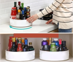 Praktyczny obrotowy organizer do szafki kuchennej lub na blat utrzyma Twoje przyprawy, leki, kosmetyki i inne drobiazgi przejrzyście w jednym miejscu. Dzięki obrotowej podstawie zapewnia szybki dostęp do przechowywanych rzeczy i pomaga utrzymać porządek w domu.