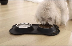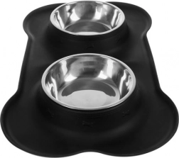Zapewnij swojemu pupilowi wygodne i czyste karmienie. Dwie miski ze stali nierdzewnej o pojemności 2 × 450 ml osadzono w elastycznej silikonowej podkładce, która wychwytuje rozlaną wodę i rozsypaną karmę. Podkładka w kształcie kości ma podwyższony rant i antypoślizgową powierzchnię, dzięki czemu pozostaje na miejscu nawet przy entuzjastycznym jedzeniu.
