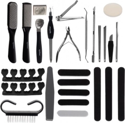 Zestaw zawiera wszystko, czego potrzebujesz do usuwania zrogowaciałej skóry, kształtowania i polerowania paznokci, pielęgnacji skórek oraz delikatnego doczyszczania detali. Eleganckie etui utrzymuje wszystkie elementy w porządku w jednym miejscu – idealne do domu, salonu i w podróży.