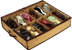 Lekka konstrukcja bez usztywnienia jest oszczędna pod względem miejsca, a uchwyty ułatwiają przenoszenie. Organizer ma 12 oddzielnych przegródek na pary obuwia i można go wykorzystać także na zabawki, paski, skarpetki czy bieliznę. Neutralny beżowy kolor z brązową lamówką pasuje do każdego wnętrza.