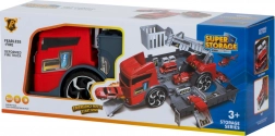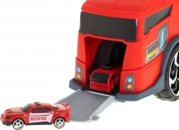Wóz strażacki działa jako transporter, który przewozi dołączone modele autek z pomocą rampy.