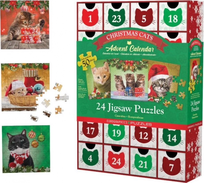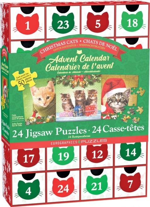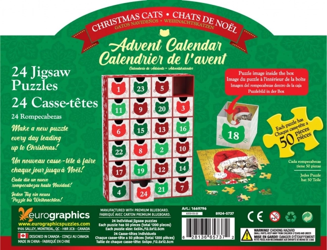 Umil sobie oczekiwanie na Wigilię z oryginalnym kalendarzem adwentowym marki EUROGRAPHICS. W środku znajdziesz 24 osobne mini puzzle z uroczym motywem świątecznych kotów, każde po 50 elementów. Kalendarz ma wielorazowe szufladki, więc po świętach możesz łatwo wypełnić je drobiazgami i użyć także w kolejnym roku.