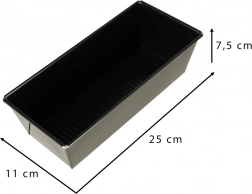 Praktyczna forma do pieczenia chleba i keksa o wymiarach 25 × 11 × 7,5 cm, wykonana z trwałej stali niskowęglowej z nieprzywierającą powłoką i teksturowanym dnem dla łatwego wyjmowania i równomiernego wypiekania. Odpowiednia do piekarników gazowych i elektrycznych, idealna do codziennego pieczenia.