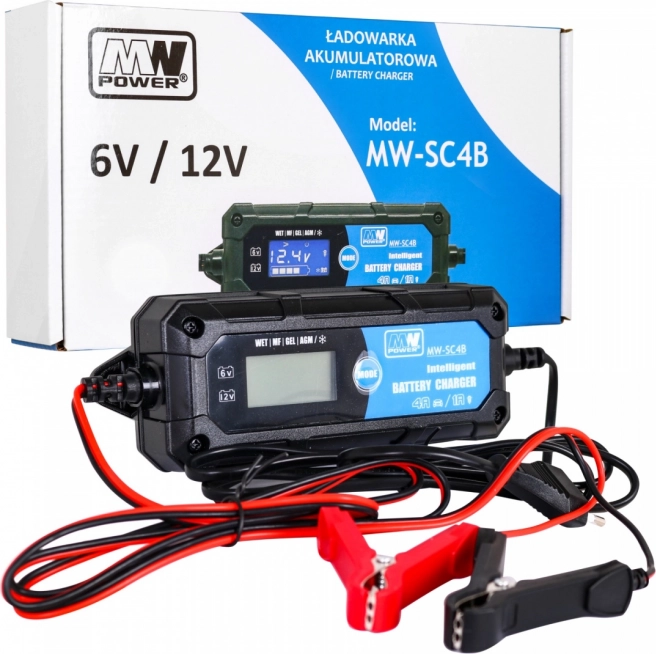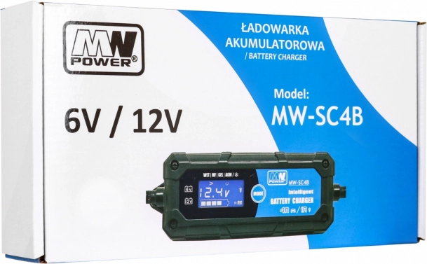 Kompaktowa i niezawodna ładowarka z wyświetlaczem LCD do akumulatorów ołowiowych 6V i 12V (WET, GEL, AGM). Oferuje wybierany prąd ładowania 1A/4A, sterowanie mikroprocesorowe, diagnostykę stanu baterii oraz tryb odsiarczania w celu przywrócenia pojemności. Idealna do motocykli, samochodów, łodzi i sprzętu ogrodowego.