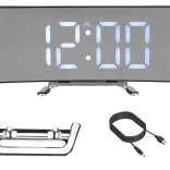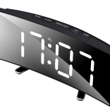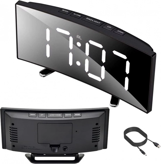Stylowy cyfrowy budzik z dużym wyświetlaczem LED oferuje prezentację czasu, daty i temperatury, praktyczną funkcję snooze oraz tryb nocny z obniżoną jasnością. Dzięki lustrzanemu wyświetlaczowi i nowoczesnemu wzornictwu świetnie pasuje na stolik nocny i biurko. Zasilanie kablem USB lub 3× bateriami AAA.