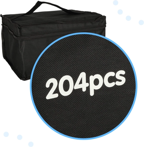 Każdy marker ma dwie końcówki – szeroką do szybkiego wypełniania większych powierzchni i cienką do precyzyjnych linii oraz detali. Praktyczny stojak utrzymuje kolory pod ręką i w porządku, a etui na zamek ułatwia przenoszenie całego zestawu.