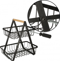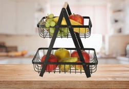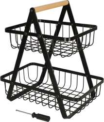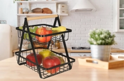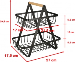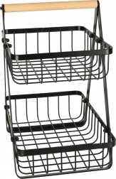 Stylowy dwupoziomowy kosz na owoce utrzyma kuchnię w porządku i doda elegancji. Dzięki solidnej metalowej konstrukcji, praktycznemu drewnianemu uchwytowi oraz dwóm poziomom oszczędza miejsce i oferuje dużo przestrzeni na ulubione owoce i warzywa.