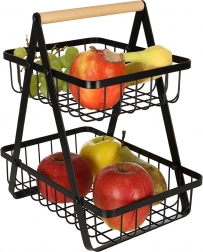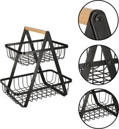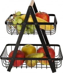 Dwupoziomowy metalowy kosz na owoce z drewnianym uchwytem, czarny
