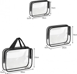 Praktyczny zestaw trzech przezroczystych kosmetyczek w rozmiarach S/M/L do idealnej organizacji w podróży i w domu. Wykonane z wytrzymałego PVC bez BPA, są wodoodporne, łatwe do czyszczenia, a dzięki transparentnemu wykonaniu natychmiast widzisz zawartość. Największa kosmetyczka ma solidny uchwyt i sprawdzi się także jako mała torebka na plażę lub na siłownię.