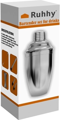 Ten zestaw obejmuje: shaker o pojemności 700 ml, miarkę barową (Jigger) 15/30 ml, łyżkę barową, muddler (tłuczek) i 2 nakładki. Shaker wyposażony jest we wbudowane sitko umożliwiające oddzielenie koktajlu od resztek składników.