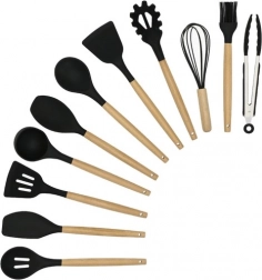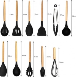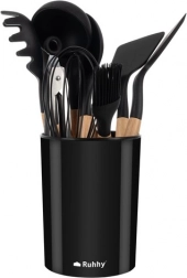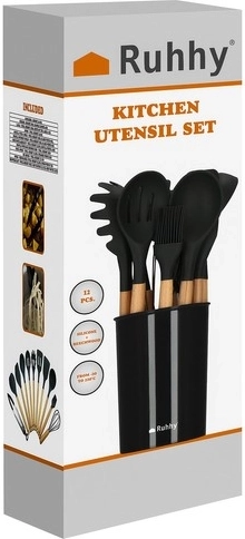 Zestaw narzędzi kuchennych marki Ruhhy zawiera 12 różnorodnych narzędzi, w tym łopatki, nabierki i pędzelki, wszystkie z ergonomicznymi drewnianymi uchwytami i wytrzymałymi silikonowymi główkami. Te narzędzia są odporne na wysokie temperatury, łatwe do czyszczenia i nie rysują naczyń kuchennych.