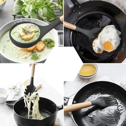 Wzbogać swoją kuchnię naszą silikonową serią narzędzi kuchennych. Zestaw ten jest idealny do bezpiecznego gotowania na teflonowych i innych nieprzywierających powierzchniach. Silikon wytrzymuje wysokie temperatury do 230 stopni i nie uszkadza powierzchni patelni i garnków.