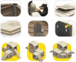 Modułowy system z 6 głównych elementów umożliwia łatwy montaż i demontaż bez narzędzi, dzięki czemu domek idealnie sprawdzi się w ogrodzie, na tarasie oraz do przenoszenia. Interaktywny dozownik suchej karmy wspiera wolniejsze i zdrowsze jedzenie oraz w zabawny sposób pobudza naturalne instynkty psa lub kota.