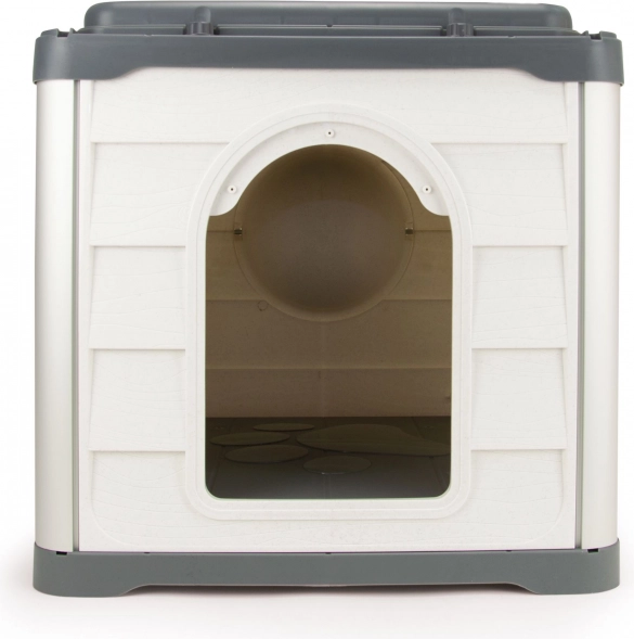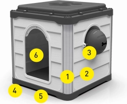 Dzięki modułowemu systemowi składa się z 6 głównych elementów: ściany z wejściem, ściany z dozownikiem karmy, dwóch pełnych ścian oraz dwóch elementów podłogi/dachu z rowkami drenażowymi ułatwiającymi czyszczenie. Składanie jest szybkie, bez narzędzi, dzięki czemu domek idealnie sprawdzi się w domu i w podróży.