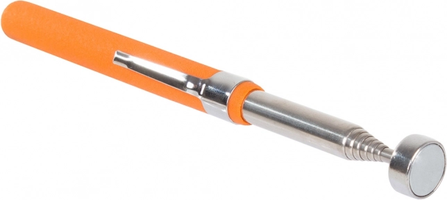 Dzięki silnemu magnesowi niezawodnie przyciąga śruby, sworznie i inne drobne metalowe elementy. Antypoślizgowa pomarańczowa rękojeść zwiększa komfort i pewność pracy, a klips do kieszeni ułatwia codzienne noszenie.