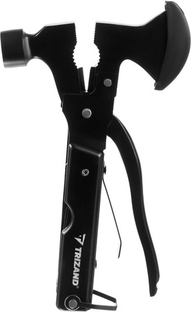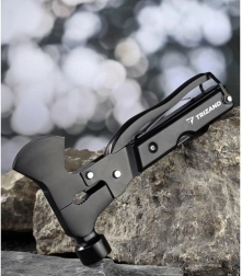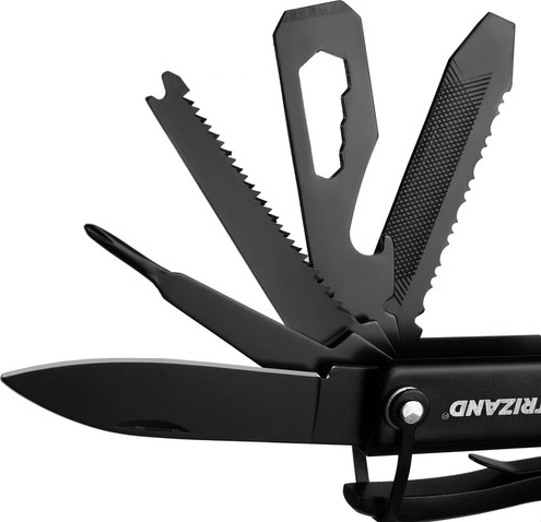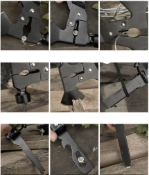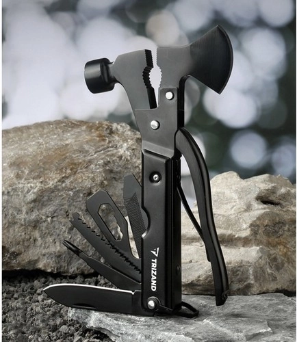 To solidne narzędzie zawiera następujące funkcje: siekiera, kombinerki, pilnik, skrobak do ryb, płaski śrubokręt, klucz sześciokątny, harpun, otwieracz do butelek, piła do drewna, krzyżowy śrubokręt, nóż, młotek, obcinacz do drutów, szczypce, amortyzator i blokada.