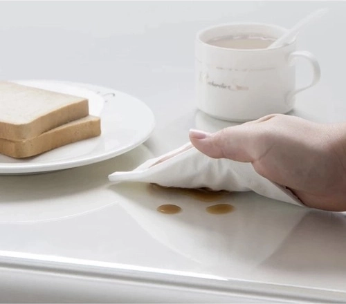 Podkładka jest całkowicie przeźroczysta i wygląda jak szklana warstwa, jednocześnie chroniąc powierzchnie przed zarysowaniami i rozlaniami.