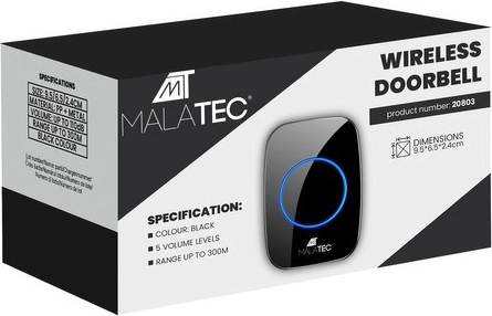 Bezprzewodowy dzwonek Malatec to nowoczesne urządzenie, które zapewni niezawodne powiadomienia o gościach dzięki szerokiemu zasięgowi do 300 metrów. Ma elegancki, czarny design i jest wykonany z wytrzymałego tworzywa ABS. Dzięki wodoodporności (IP44) jest odporny na deszcz i śnieg.