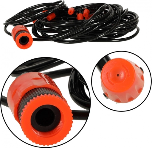Przewód łatwo podłączysz do standardowego węża ogrodowego lub bezpośrednio do kranu. Regulacja przepływu na dyszach pozwala dopasować intensywność mgiełki do różnych miejsc. Dzięki możliwości skrócenia przewodu ustawisz rozstaw dysz dokładnie według swoich potrzeb i skierujesz wodę tam, gdzie jest najbardziej potrzebna.