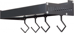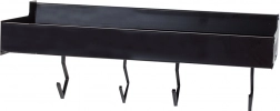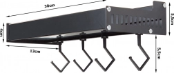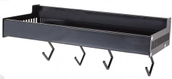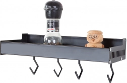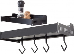 Elegancka i wytrzymała ścienna półka z czarnego, proszkowo lakierowanego aluminium wprowadzi porządek i styl do Twojego domu. Doskonale sprawdzi się w kuchni, łazience i przedpokoju. Dzięki podwyższonemu rantowi oraz czterem odpinanym haczykom bezpiecznie utrzyma przyprawy, kosmetyki i akcesoria na swoim miejscu. Solidne wykonanie, łatwy montaż na ścianie oraz uniwersalny design czynią z niej praktyczne rozwiązanie do codziennej organizacji.