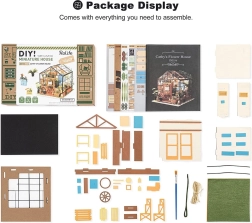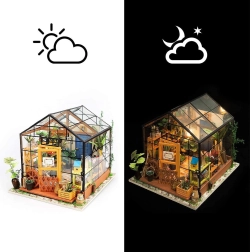 Odkryj urok miniatur z modelem Robotime Mini Szklarnia. W pudełku znajdziesz wstępnie wycięte elementy ze sklejki, papierowe nadruki, tkaninowe i metalowe detale, które po pomalowaniu i sklejeniu stworzą efektowną szklarnię pełną roślin i akcesoriów ogrodowych. Oświetlenie LED nada gotowemu modelowi ciepłą, przytulną atmosferę.