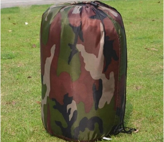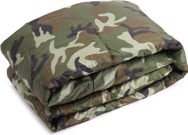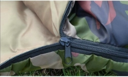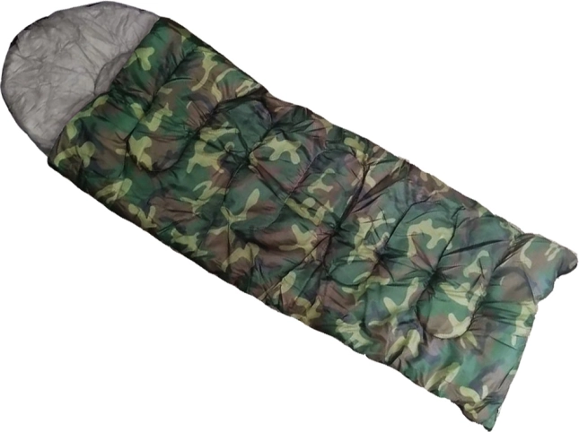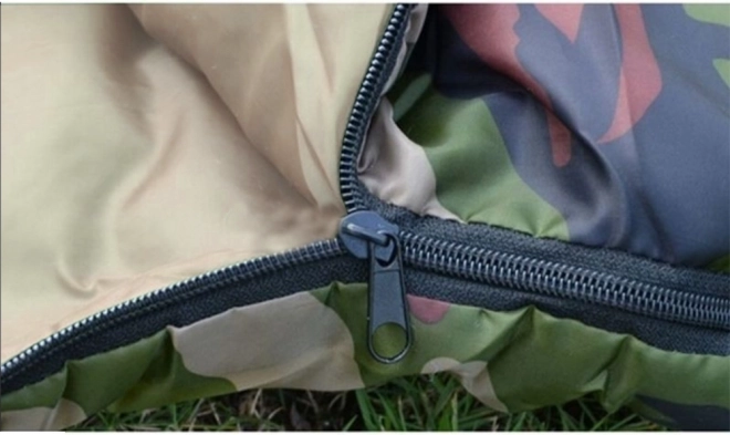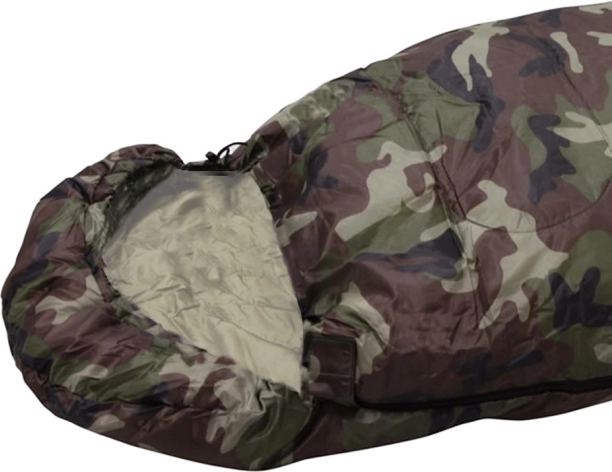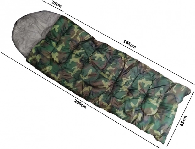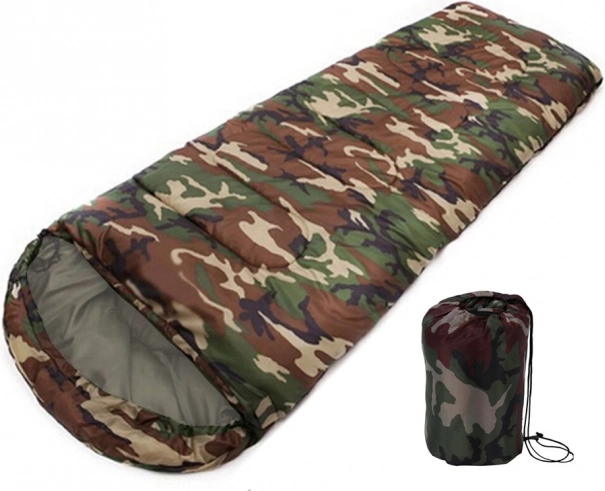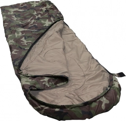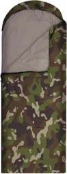 Jednoosobowy śpiwór w kamuflażowym wzorze do biwakowania i turystyki. Ma zamek na całej długości, zintegrowany kaptur ze ściągaczem oraz lekką, wytrzymałą konstrukcję z izolacją poliestrową, która skutecznie zatrzymuje ciepło. Można go całkowicie rozpiąć i używać jako koc.