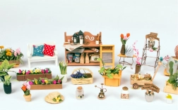 Miniaturowe kwiaty, meble, poduszki i dodatki tworzą wierną atmosferę ogrodowego tarasu – idealne jako stylowa dekoracja domu.