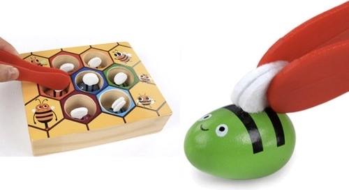 Łapanie pszczółek za skrzydełka przy pomocy pęsety wzmacnia paluszki, poprawia chwyt i koordynację oko–ręka. To zabawne wyzwanie uczy precyzji i cierpliwości.
