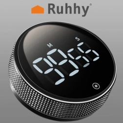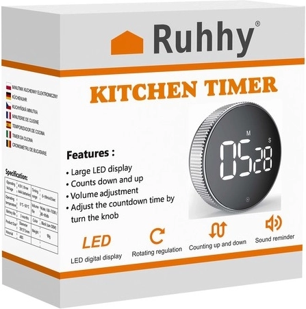 Praktyczny cyfrowy minutnik RUHHY z dużym wyświetlaczem LED, magnesem do mocowania oraz funkcją stopera ułatwi gotowanie, trening i gry. Oferuje regulowaną głośność, precyzyjne odliczanie do 99 min 55 s oraz proste sterowanie jednym dotykiem.