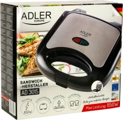Praktyczny opiekacz ADLER AD 3015 przygotuje chrupiące, gorące tosty w mgnieniu oka. Dzięki mocy znamionowej 750 W i płytom z powłoką nieprzywierającą pieczywo się nie przypala, a czyszczenie jest łatwe. Kontrolka termostatu informuje o gotowości do pieczenia, a antypoślizgowe nóżki zapewniają stabilność na blacie kuchennym.