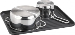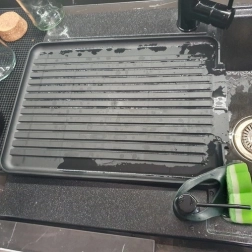 Specjalnie wyprofilowana taca z żebrowaniem i bocznym odpływem kieruje wodę prosto do zlewu. Blat pozostaje dzięki temu suchy i czysty.