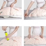 Worki próżniowe po odessaniu powietrza znacząco zmniejszają objętość przechowywanych rzeczy, dzięki czemu w szafie i walizce zmieści się znacznie więcej ubrań i pościeli.