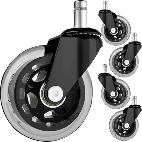 Zestaw pięciu kółek nadaje się do krzeseł biurowych, gamingowych, obrotowych lub dziecięcych, kompatybilny z większością krzeseł na rynku z osią o średnicy 11 mm.