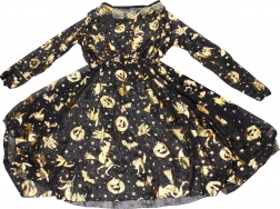 Elegancki kostium karnawałowy czarownicy w złotym kolorze zawiera sukienkę i kapelusz i jest idealny na karnawał, bal maskowy oraz Halloween. Dostępny w rozmiarach S, M, L.