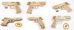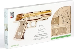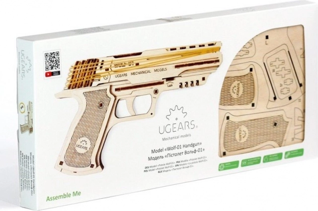 Model UGEARS Wolf-01 to szczegółowa drewniana replika pistoletu z napędem na gumki, którą złożysz bez kleju, wyłącznie przy użyciu precyzyjnie wyciętych elementów. Po złożeniu otrzymasz funkcjonalny model mechaniczny, który niezawodnie wystrzeliwuje gumki i pokazuje w praktyce współpracę kół zębatych, mechanizmu spustowego oraz sprężystości materiałów.