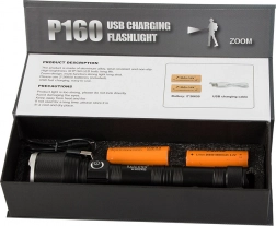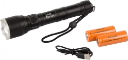 Ładowanie baterii jest łatwe dzięki kablowi USB-C, a diody LED informują o stanie naładowania. Zestaw zawiera latarkę, dwie akumulatory do ładowania i pasek do zawieszenia.