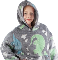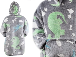 Praktyczny kaptur chroni głowę przed chłodem i posłuży także jako poduszeczka. Przestronne rękawy oraz uniwersalny rozmiar zapewniają komfort dla chłopców i dziewczynek. Wzór w dinozaury ma fluorescencyjne elementy, które po naświetleniu świecą w ciemności.