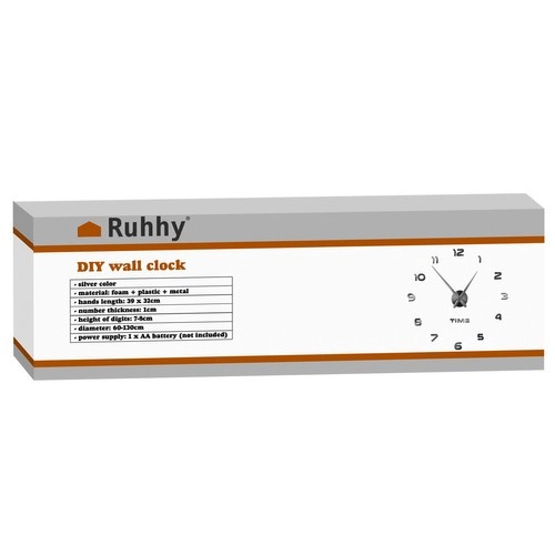 Stwórz oryginalną, dominującą ozdobę ściany dokładnie na wymiar. Zegar ścienny DIY RUHHY pozwala dowolnie wybrać średnicę od 60 do 130 cm i rozłożenie cyfr – klasycznie w okręgu lub kreatywnie, zgodnie z Twoją fantazją. Błyszczące akrylowe nakładki na cyfrach z efektem 3D nadają przestrzeni nowoczesny, minimalistyczny wygląd.