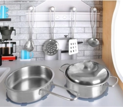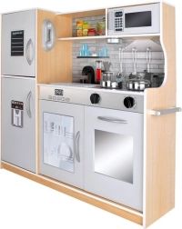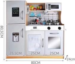 Kuchnia wykonana jest z wysokiej jakości drewna, dzięki czemu jest stabilna, trwała i bezpieczna. W zestawie znajduje się bogate metalowe akcesorium – garnek, patelnia, pokrywka oraz 4 przybory kuchenne – oraz wyjmowany zlew ułatwiający „mycie” naczyń. Neutralny design i kolory pasują zarówno dla dziewczynek, jak i chłopców.