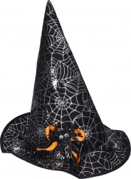Piękny czarny kapelusz z pająkiem i srebrnymi pajęczynami to idealny dodatek dla wszystkich małych czarodziejów.
