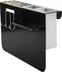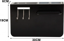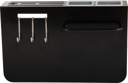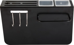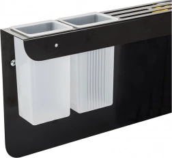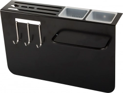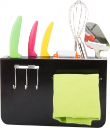 Trzy haczyki i dwa pojemniki do łatwego rozmieszczenia noży i narzędzi kuchennych.