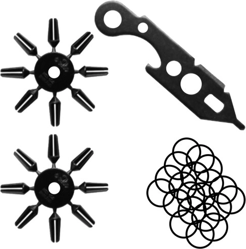 Zestaw obejmuje 12 lotek, 100 zapasowych grotów, osłonki ochronne i wielofunkcyjne narzędzie.