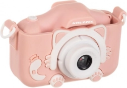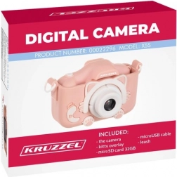 Uroczy dziecięcy aparat KRUZZEL z 2'' ekranem umożliwia robienie zdjęć i nagrywanie filmów w Full HD, ma przedni aparat do selfie, 5 wbudowanych gier oraz mnóstwo zabawnych ramek i filtrów. W zestawie znajduje się karta 32 GB, ochronna silikonowa kocia obudowa, smycz i kabel USB – idealny pierwszy aparat dla małych fotografów od 3 lat.