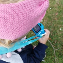W zestawie znajduje się karta pamięci 32GB, więc dzieci mogą od razu zacząć tworzyć. Nie brakuje aparatu do selfie, wielu zabawnych ramek i filtrów (czarno-biały, sepiowy, negatyw), zdjęć seryjnych oraz auto‑wyłączania w celu oszczędzania energii. Silikonowa kocia nakładka ochronna i pasek zapewniają bezpieczne noszenie.