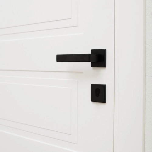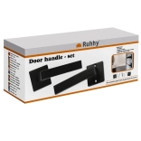 Nowoczesny zestaw klamek drzwiowych Ruhhy w matowej czerni do drzwi wewnętrznych oferuje uniwersalny montaż na drzwi lewe i prawe, cichą pracę oraz stabilne mocowanie z dociskiem imbusowym. W komplecie znajduje się kwadratowa rozeta dla czystego wyglądu i ochrony otworu, kompletne akcesoria montażowe oraz ergonomiczna rękojeść dla wygodnego otwierania.