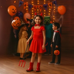 Stylowy diabelski kostium w intensywnie czerwonym kolorze przemieni każde dziecko i dorosłego w mgnieniu oka. Dzięki miękkim materiałom i elastycznym uchwytom dodatki łatwo się zakłada i wygodnie trzymają przez cały czas zabawy. Zestaw idealny do domowych zabaw w odgrywanie ról, szkolnych akademii, sesji zdjęciowych i imprez.