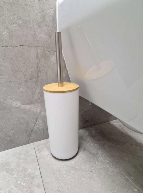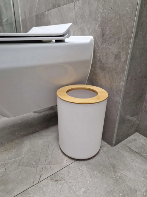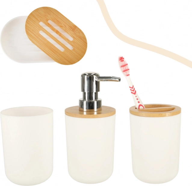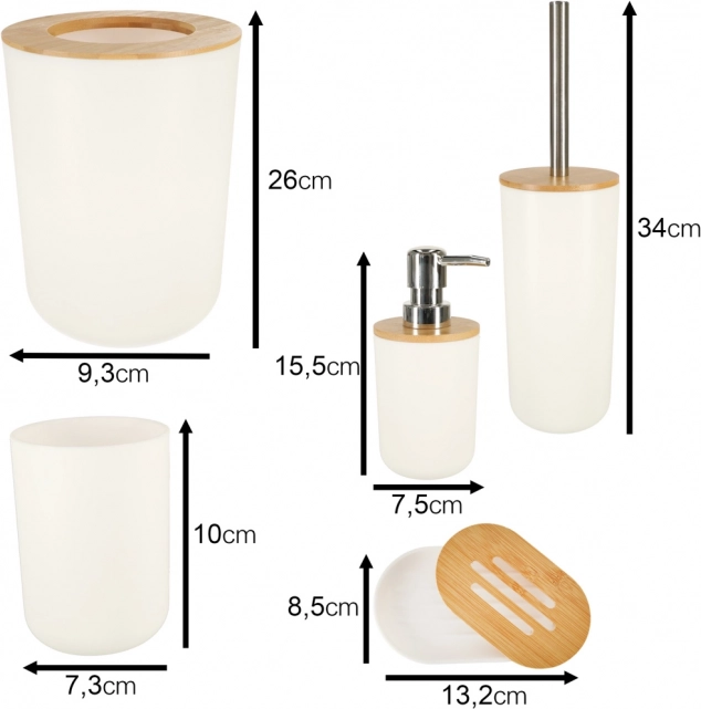 Zestaw obejmuje podstawowe wyposażenie do umywalki i strefy WC. Wytrzymałe plastikowe korpusy z bambusowymi detalami są lekkie, higieniczne i łatwe do umycia – idealny wybór do nowoczesnych łazienek.