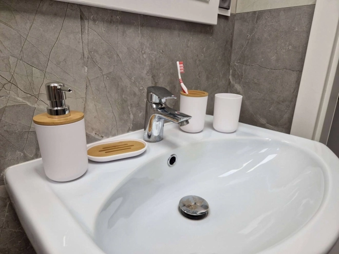 - Kompletny zestaw do umywalki i WC: mydelniczka, dozownik, kubek, stojak na szczoteczki, szczotka WC, kosz